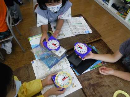 算数科では、時計の読み方の学習をしました。時計には、短い針と長い針があること、12までの数字が並んでいることを確かめ、時計の模型を使って何度も練習しました。