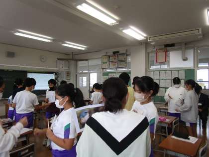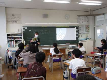 教育実習生の先生と英語の学習をしました。ゲームをしながら発音するうちに、「どこに住んでいますか」「〜に住んでいます」の言い方を楽しく身に付けることができました。