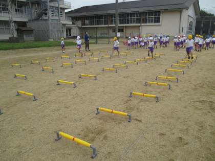 体育科で、ハードルを使った運動遊びをしました。リズムよく走り抜けるよう、腕の振り方や足のあげ方をよく考えながら体を動かしていました。