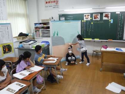 国語科の「うみのかくれんぼ」の学習では、何度も音読したり読み取ったことを動作化したりして、内容を読み取りました。敵から隠れるため、獲物を見付けるための、生き物たちの「かくれんぼ」に興味津々でした。