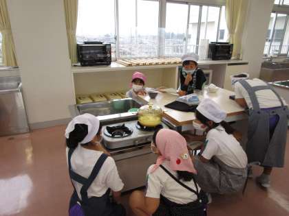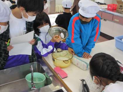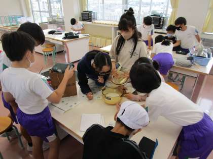 子供たちは普段見ることのできない炊飯時の様子を観察しようと興味津々で授業に取り組んでいました。「宿泊学習では鉄鍋で炊飯したけど、なべの種類で味は変わるのかな?」という疑問が生まれていました。