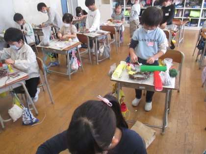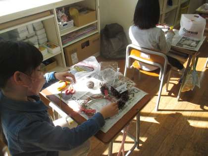 片付けたアサガオのつるで、リースを作りました。ボンドやグルーガンを使って、思い思いに飾り付けをしていました。出来上がりが楽しみです。