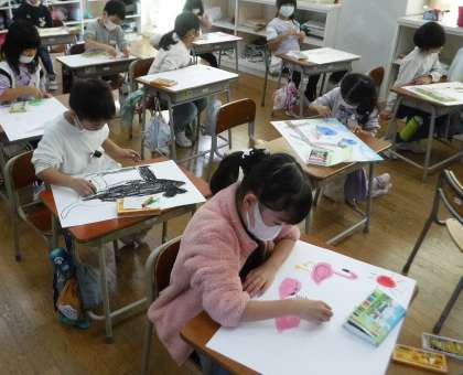 図画工作科の学習では、心に残った動物の絵を描いています。「フラミンゴが1本足で立っていたよ」「カラフルなオウムを見たよ」「トラがかっこよかったよ」と、一番心に残った動物の絵を思いのままに、のびのびと描いていました。
