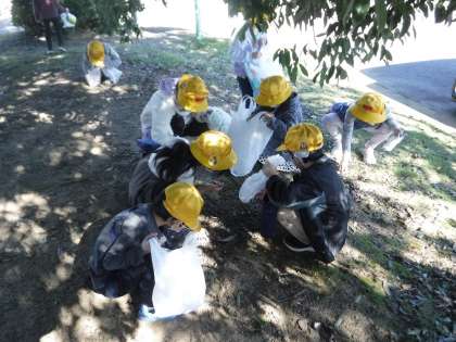 1年生は、生活科の学習「あきを見つけよう」のために、岩瀬スポーツ公園に行きました。入り口にたくさんドングリが落ちていて、袋いっぱい拾う姿が見られました。「このドングリ、帽子が付いているよ」「緑と茶色のドングリだ」と、見付けたことを友達や先生に話していました。