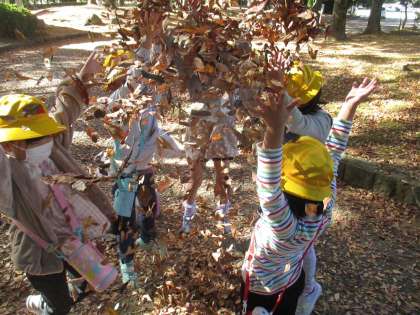 少し公園に入ると、たくさん落ち葉が落ちていて、足で踏みしめて感触を確かめたり、集めて雨のように降らせたりして遊びました。