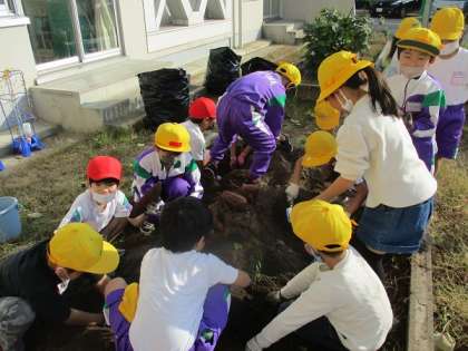 5月に植えたサツマイモの苗もすっかり大きくなったので、収穫しました。大きなサツマイモが出てくると、みんな「すごい」と歓声が上がりました。