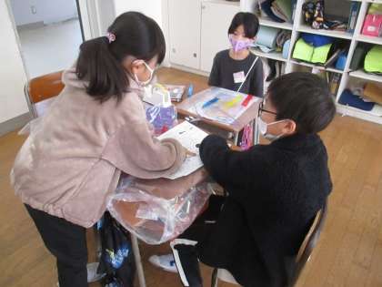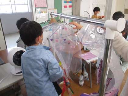図画工作科の学習で、「ひらひらゆれて」をしています。風に揺れる飾りをつくるために、材料を選んだり、形を工夫したりしています。風に揺らして試しながら、自分だけの素敵な作品をつくろうと一生懸命です。グループで活動しているため、友達同士協力しながら進めているところも素敵です。