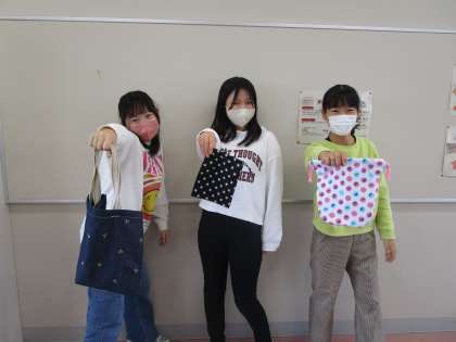 今週も地域の方に教えていただきながら、家庭科の袋作りを進めています。一人一人思いが込められたバックが出来上がってきています。「お気に入りの本を入れたい」「習い事のバックとして使いたい」など、完成を喜んでいました。