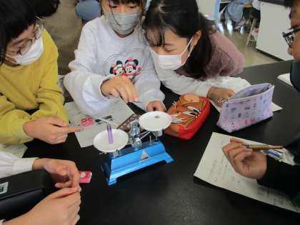ピンセットで分銅を持つのに苦労していましたが、「もう少しでつり合うよ!」「あと0.2gのせてみよう」などと声をかけあいながら、グループで協力して消しゴムや鉛筆の重さを量ることができました。