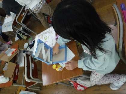 1年生は、生活科の時間に見付けてきたどんぐりやまつぼっくり、落ち葉等を使って、おもちゃづくりをしています。初めはみんなでどんぐりごまをつくりましたが、今は、どんぐりを使ったマラカスや、やじろべえ、どんぐりころころ、まつぼっくりを使ったけんだま、落ち葉を使ったこすりだしなど、自分のしたいことを考えて、思い思いにつくっています。