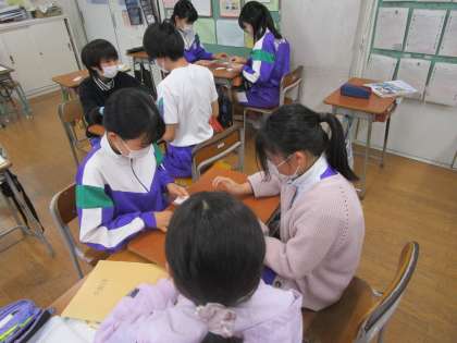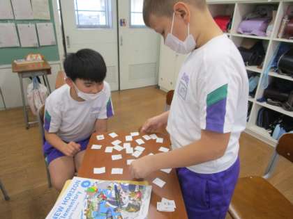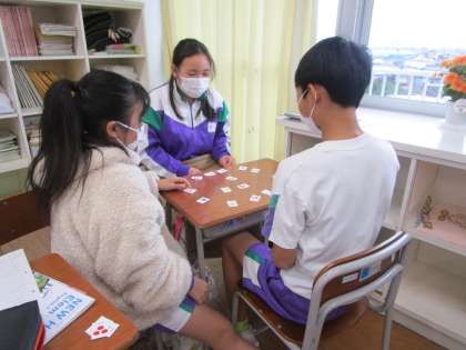 外国語の学習では、たくさんの英単語を覚えています。英単語カードを使って神経衰弱を行いました。中学校に向けて、英語を話したり、書いたりする機会を増やしていきたいと思います。