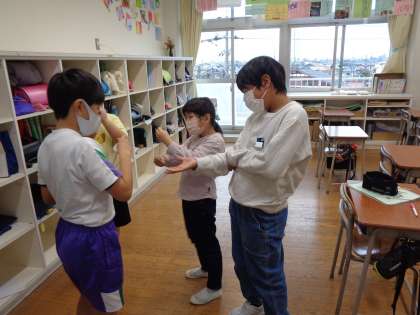 「ハンカチ落とし」「新聞たたみ」「だるまさんが転んだ」「絵しりとり」といった子供達にとっておなじみの活動をしている班、「けん玉」「「お手玉」といった伝承遊びの班、テレビ番組や過去にやったことがあるものを取り入れてみた班など、今回は班によって活動内容に個性が見られました。