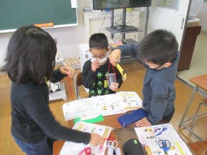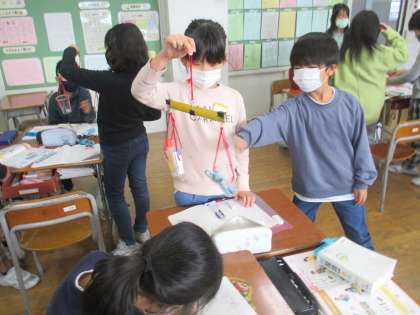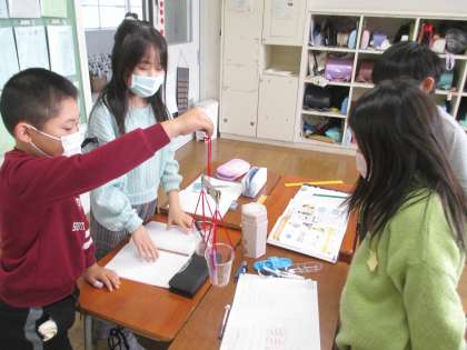 算数の学習では、手作り天秤を使って身の回りのいろいろな物の重さを比べました。