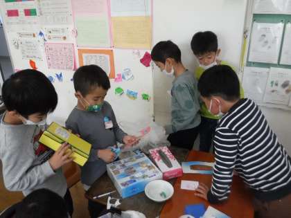 生活科のあきのおもちゃ作りが進み、始めは一人でつくりたい物をつくっていた子供たちも、だんだん友達と協力してつくるようになってきました。