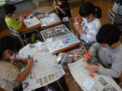 昔から伝わる遊びを楽しもうと、1年生は、こまやけん玉、お手玉などに挑戦し始めました。まずは、自分だけのこまをつくろうと、マジックで着色しています。回ったら、色が変わることを知り、何色になったら楽しいか考え、色塗りをしていました。