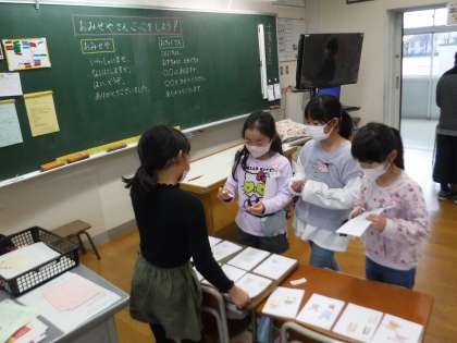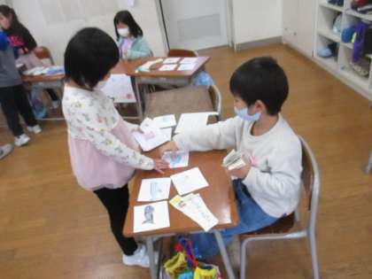 国語科「ものの名まえ」で、上位語と下位語の関係を学習しました。学習したことを活かして、お店屋さんごっこをすることになり、魚屋、服屋、楽器屋等になって、たくさんの言葉を集めて商品を作りました。