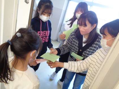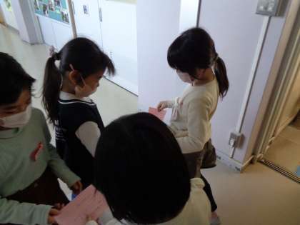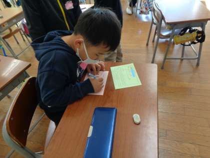 なかよしタイムに、1年生の子供達が階段を上って2年生の教室前にいたり、6年生が1年生に声をかけたりしながら、名刺交換を行っていました。1年生のリクエストに応えて、名前にふりがなを振ったり、「○○っていうよ」と自己紹介したりする姿を見られました。