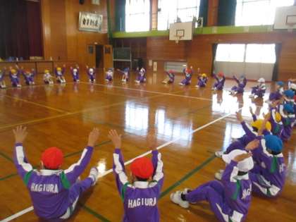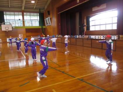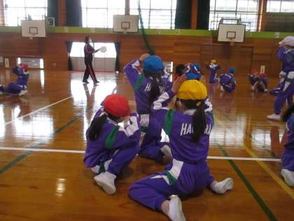 体育科の学習で、表現遊びをしています。みんなで輪になって、手本の動きをそっくり真似たり、動物や家電になって動いたりしています。