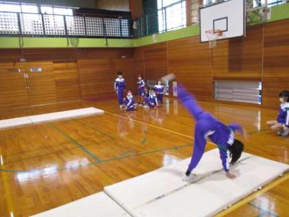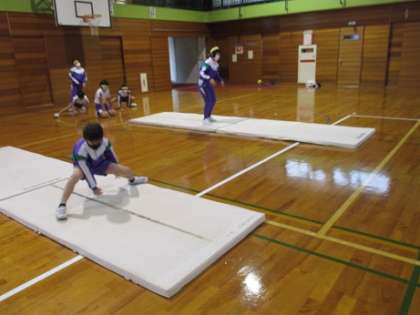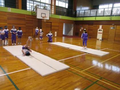 キャッチバレーボールが終わって、体育科ではマット運動を始めました。自分の動きを友達に見てもらったり、動画を撮って自分の動きを確認したりと様々な方法で、キレイに技を決めようと頑張っています。