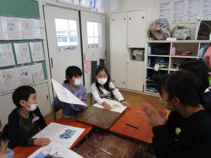 1年生の国語科の学習の発表会に招待されました。1年生は、調べた車について6年生に一生懸命伝えていました。6年生は「1年生の字が上手だった」「ぼくたちも1年生の時に勉強したことを思い出したよ」などと話していました。学習で他の学年と交流するのもいいなと感じました。