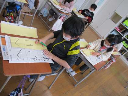 始業式の後には、書初大会を行いました。用紙を前にし、どの子の顔も真剣です。