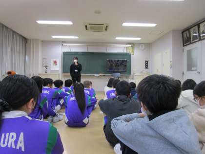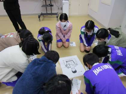 養護教諭から心肺蘇生法についての話を聞いた後、実際にAEDを見ながら使い方を確認しました。いざという時に今日学んだことが生かせるといいと思います。