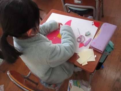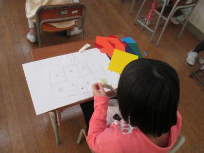 図画工作科の学習で、紙版画をしています。テーマは「お城」です。どのようなお城にするか考えた後、色が付いたシールを貼っていきます。最後には、シールについた色が、別の紙にうつります。完成が楽しみです。