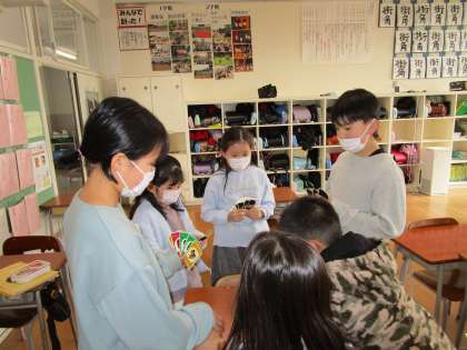 なかよし班の友達と一緒に、6年生が考えた遊びをして楽しみました。どの班も手作りかるたや、ボーリング等工夫を凝らした遊びをしていました。下級生に、「楽しかった」と言われ、6年生はとても嬉しそうでした。