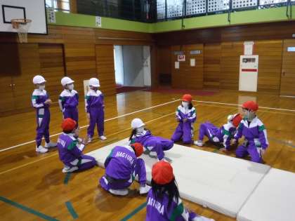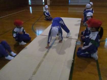 体育科で、マットを使った運動をしています。犬走り、クマ歩き、ウサギ跳び等の動物歩きをしたり、ゆりかごやアンテナ等の技につながる動きをしたりしています。