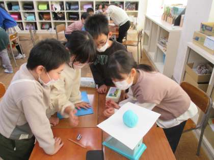 3年生は理科で重さを比べる学習をしています。今日は粘土の形を変えて、重さが変わるのかを調べました。