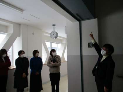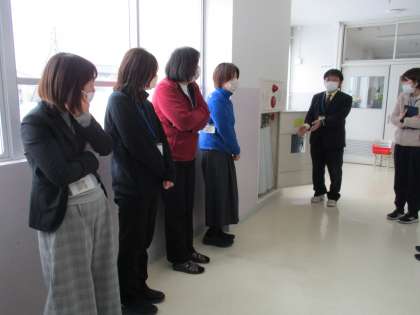 子供が帰った午後、教職員による消防施設訓練を行いました。防火シャッターの仕組みや消火栓の使い方について、防災担当の説明を聞いたり、実際に体験したりしました。