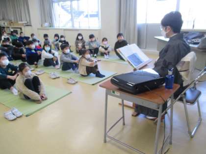 朗読家の先生が来校してくださり、たくさんのお話を聞かせてくださいました。頭の中で場面を想像したり、富山弁での朗読を味わったりしながら、楽しい時間を過ごしました。