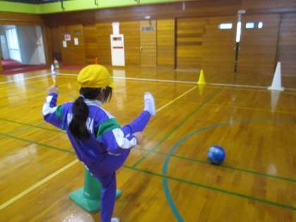 体育科の学習で、ボール蹴り遊びをしました。相手に向かって蹴ったり、コーンとコーンの間を狙って蹴ったりしました。