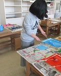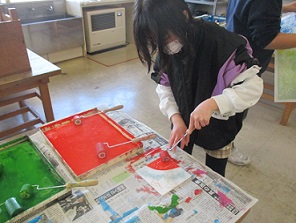 スチレンボードの版を刷る作業に入りました。テーマに合った色を付けて、丁寧に仕上げています。