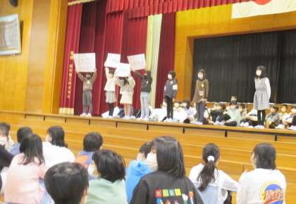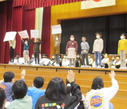 3年生は6年生の卒業を祝う会で、思い出クイズを出題しました。6年生に小学校での思い出を楽しみながら振り返ってもらうことができました。
