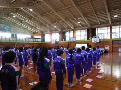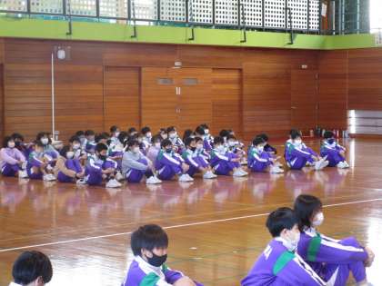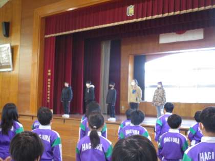 引継ぎ式の後に、4,5年生から歌のプレゼントがありました。「ありがとう」のメッセージが伝わる優しい歌が体育館が響きました。6年生からは、4,5年生に「これからの萩浦小学校をお願いします」という気持ちを込めて、力強いエールを送りました。