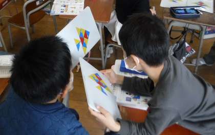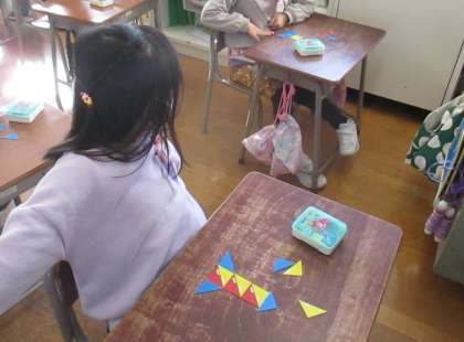 三角形の色板を並べると、いろいろな形の四角形や大きな三角形ができることに気付き、それを生かして、いろいろな形を作っています。