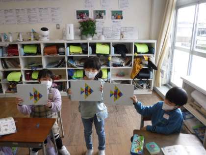 算数科は、最後の単元になりました。1年生は、色板をつかった「かたちづくり」学習を始めています。
