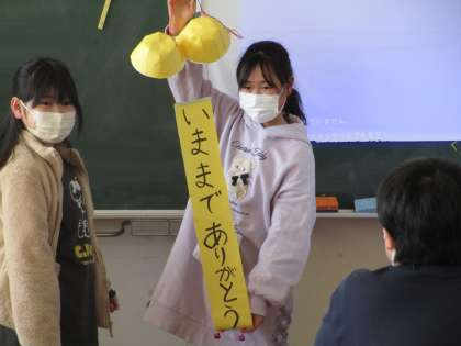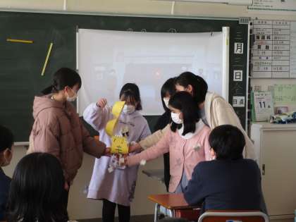 4年生が突然教室に来て、プレゼントをしてくれました。それは手作りのくす玉で、6年生がひもを引っ張ると、中から「ありがとう」の文字と紙ふぶきが出てきました。「すごい」と歓声がわき上がった後、4年生の優しさで教室が温かい空気に包まれました。