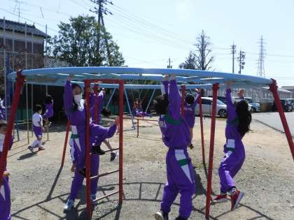 とても晴れた今日、雲梯や登り棒等を使った運動をしました。使い方を覚え友達と一緒に遊びました。