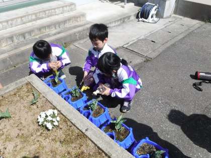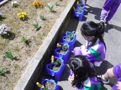 温かくなり春めいてきました。秋に球根を植えたチューリップも少しずつ大きくなり、とうとう蕾が出始めました。「こんなに大きくなっているよ」「このチューリップは赤色かな」と友達と成長を見比べながら、観察したり水やりをしたりしていました。