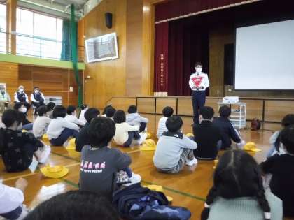 今日は、富山中央警察や北交番、交通安全協会、交通指導員、スクールガードリーダー、交通安全母の会から講師をお招きし、交通安全教室を行いました。