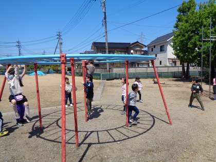 お天気もよかったので、グラウンドを走って鬼ごっこをししたり、遊具で遊んだりしました。元気いっぱい、体を動かしました。