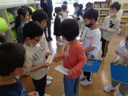 今日は、学校紹介の本番でした。まずは、各クラス色団ごとに集まって、自己紹介をしました。2年生が名刺を作り1年生に渡しました。「よろしくね」「仲良くしようね」と声をかけて渡しました。