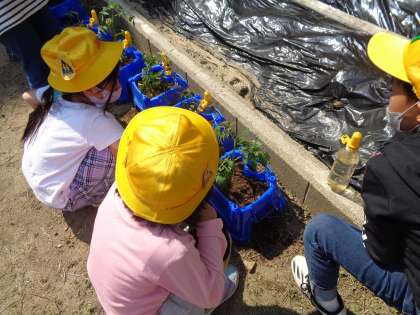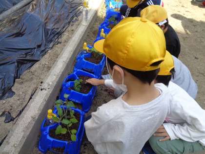 子供たちが育てたい野菜を選んで持ってきたものを、あさがおを育てていた鉢に植えました。「元気に、大きく成長してほしい。」「お世話を頑張るぞ。」と、これからの活動にわくわくしている様子が見られました。