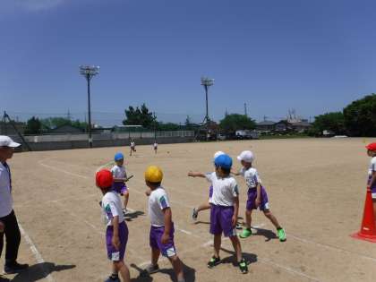 少し小さめのトラックでのリレーに挑戦しています。最後までバトンがつながるよう、一人一人が精一杯走り、頑張っています。