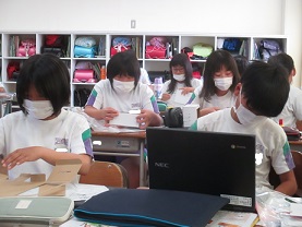 クランクの仕組みを使っておもちゃを作っています。どの子供も、何をどのように動かそうかと、真剣に考えています。クランクを動かしてみることで、作品の仕上がりをイメージする子供がいました。また、インターネットを利用して、様々な作品を鑑賞してイメージを膨らませている子供もいました。スケッチや設計図を描いてみる子供もいました。それぞれが、自分に合った学び方をして、制作活動に取り組んでいます。