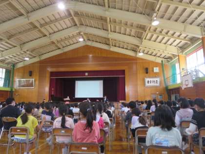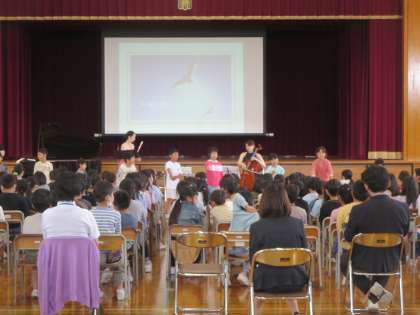 フルートやビオラ、ピアノの演奏を聴きました。途中、3年生の代表の子供たちが音楽に合わせて詩の発表をしました。音楽と詩が合わさると、とても素敵になりました。