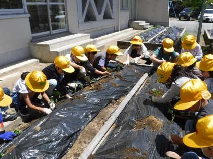 2年生は、個人で育てている野菜とは別に、みんなでサツマイモを育てます。サツマイモの苗をみんなで植えました。おもしろい形をしていることに気付き、そうっと植えていました。大きくなるのが楽しみです。
