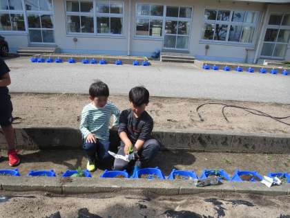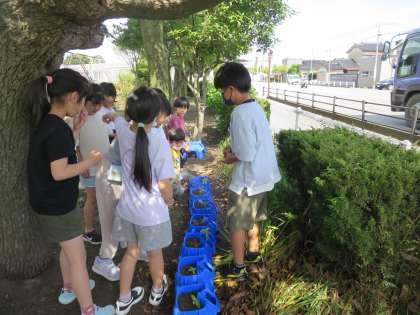 教室で育ててきたホウセンカを、植木鉢に植え替えました。これからの成長を楽しみにお世話を続けていきます。